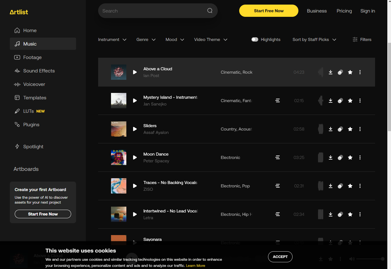 Artlist et Storyblocks : Ces plateformes offrent une large sélection de musiques libres de droits, d’effets sonores et de vidéos d’archives. Idéal pour ajouter une touche d’émotion ou de dynamisme à vos créations.